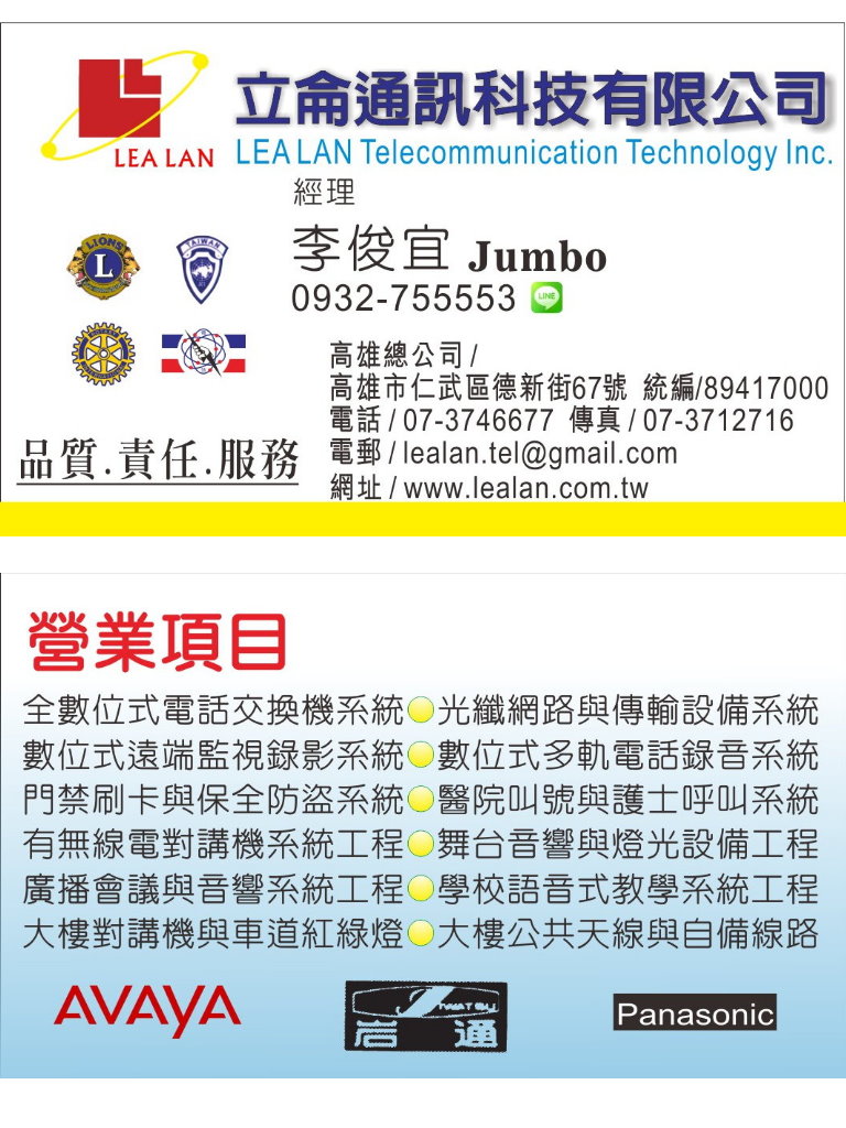 聯 絡 資 訊 經 理:李俊宜 Jumbo 公司電話:07-3746677 公司傳真:07-3712716 公司地址:高雄市仁武區德新街67號 電子郵件:lealan.tel@gmail.com 公司網址:www.lealan.com.tw