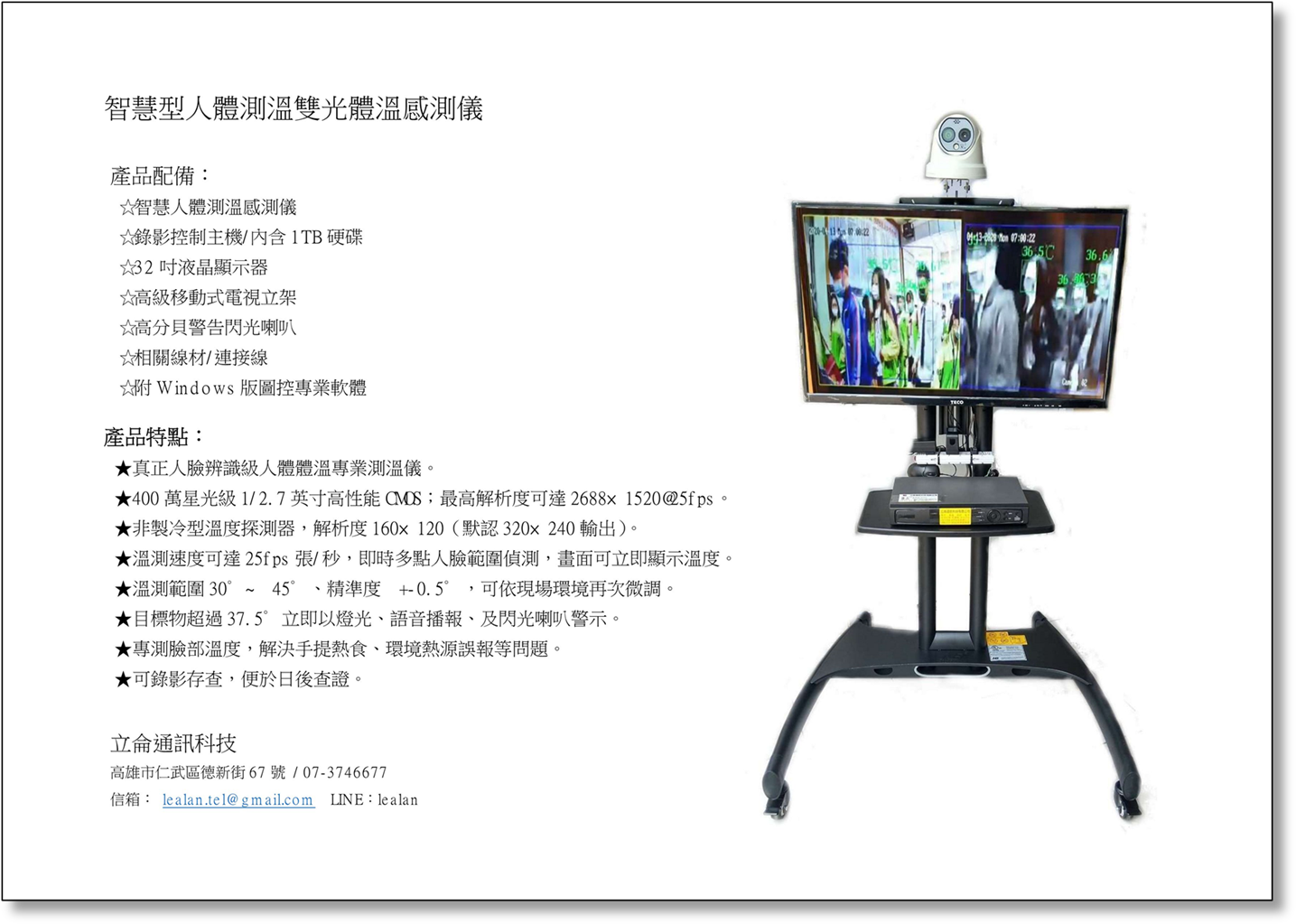 本土案例暴增,疫情持續升溫,讓本公司:智慧型人體測溫雙光體溫感測儀/體溫感測器,成為您防疫的最佳助手;只測額溫、不會手提熱食誤報,一個畫面可同時檢測10位、連續測溫、不耽誤進場動線,可語音提示、閃光警報絕不漏接,自主管理免耗人力,操作簡單、功能完整,特價優惠中,歡迎來電洽詢!李先生0932755553
